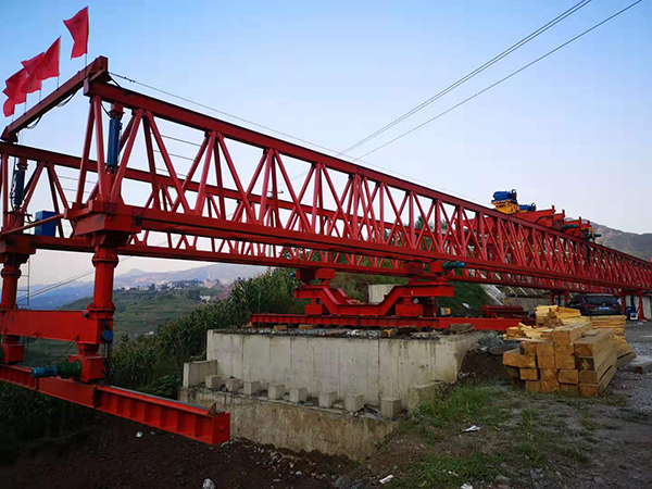 紅旗型架橋機和燎原型架橋機屬此類,吊重也是130噸。其吊臂是由左右兩條箱梁組成,兩梁貫通機身并向前后端伸出。在兩端都有各由兩腿桿組成的折疊立柱。紅旗型兩梁的中距為3.4米,燎原型的則為4.8米。橫跨兩條箱梁有兩臺桁車,能沿吊臂縱向行駛。吊梁小車置于桁車上,能沿桁車橫向行駛。待架的梁片(或整梁)可用鐵路平板車直接送到架橋機的后臂之下,用吊梁小車起吊后,憑桁車前移,再以吊梁小車橫移,然后落梁就位。這類架橋機的前后端都可吊梁及落梁;改變架梁方向時,不需要調頭;為適應曲線架梁,前后臂都可在水平面內擺動;分片架設時不必移梁或撥道,梁即可就位;"喂梁"也不需要橋頭岔線或特制運梁車。